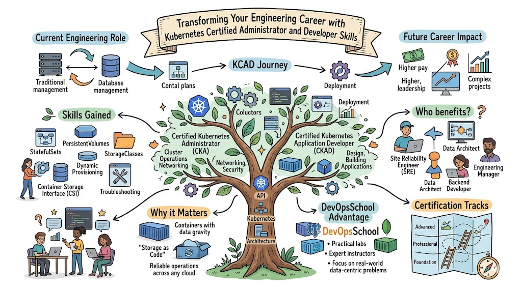 The Kubernetes Certified Administrator & Developer (KCAD) is a professional-grade validation that certifies an engineer’s ability to handle the “Full Stack” of container orchestration. It exists to bridge the gap between simple deployment and long-term operational health, focusing on how to build clusters that are not only functional but also observable and maintainable. This certification proves that a practitioner can navigate the complexities of resource scheduling, pod affinity, and lifecycle hooks. It is specifically designed to reflect the real-world challenges of distributed systems, ensuring that certified professionals can handle the intense demands of production-grade cloud environments.