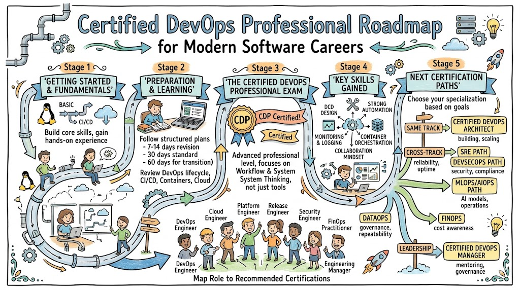 This path is best for professionals who want stronger ownership in automation, delivery systems, release management, cloud workflows, and platform engineering. Start with DevOps basics, build real experience, grow into professional-level capability, and then move toward architect-level responsibility.