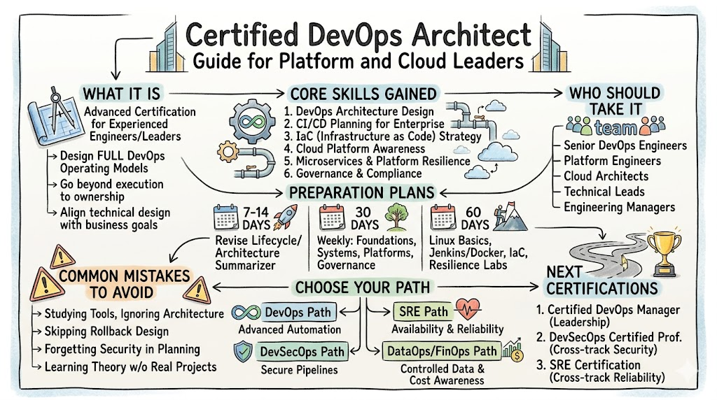 Certified DevOps Architect is a valuable certification for professionals who want to move from execution-focused work into system-level design and technical leadership. It brings together automation, CI/CD planning, cloud strategy, infrastructure design, security awareness, governance, resilience, and scalable delivery practices into one strong learning path. For engineers, it builds broader technical maturity. For managers, it improves understanding of how modern platforms should be designed. For senior professionals, it supports growth into architecture and leadership positions. If your goal is to design stronger delivery systems, improve standards across teams, and take on greater technical responsibility, this certification is a smart step forward